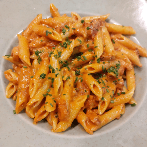 Préparé avec des pâtes au choix et servi avec une sauce vodka et lardons